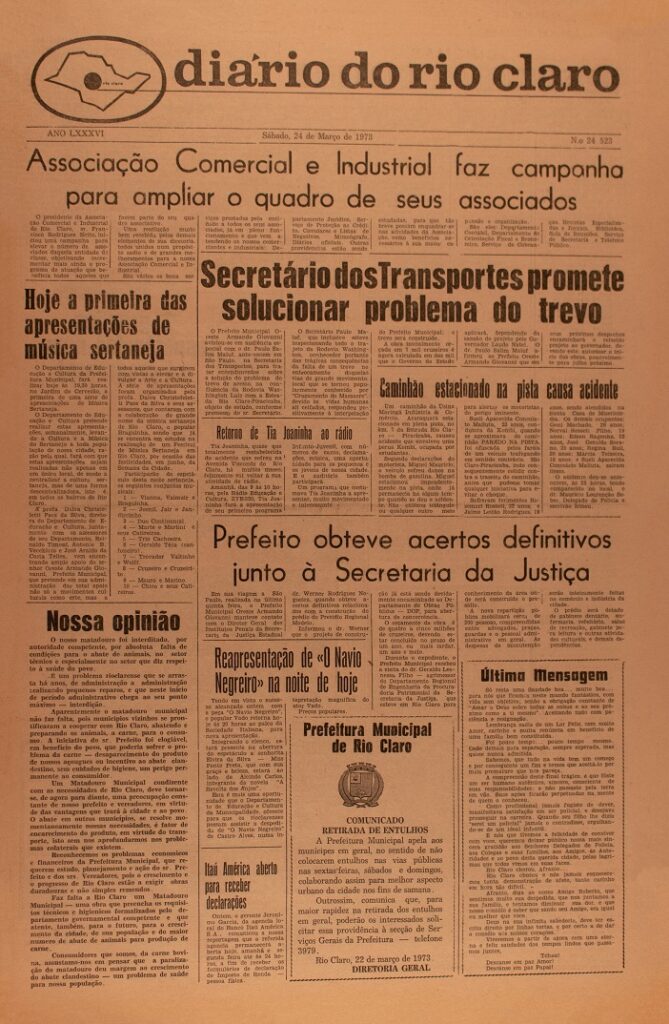► Secretário de Transportes promete solucionar problema do trevo. O Secretário Paulo Maluf respondeu a interpelação do Prefeito Municipal Oreste Armando Giovani e garantiu que “o trevo será construído”. A obra inicialmente orçada em 7 mil cruzeiros, agora calculada em dez mil que o Governo do Estado aplicará, dependendo da sanção do projeto pelo Governador Laudo Natel.