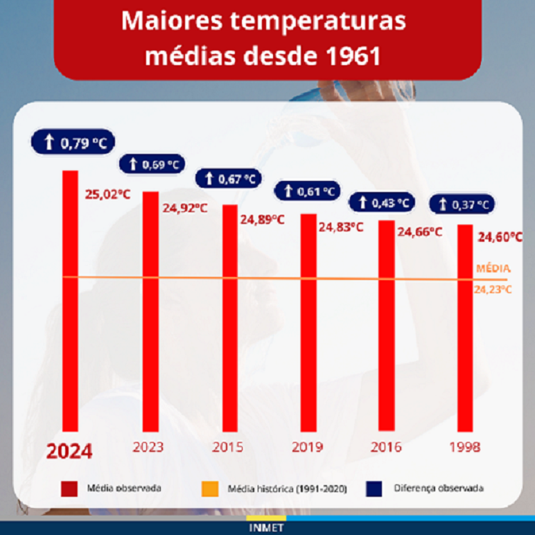 O Instituto Nacional de Meteorologia do Brasil (Inmet), órgão vinculado ao Ministério da Agricultura e Pecuária, apontou o ano de 2024 como o mais quente no Brasil em levantamento que considerou desde o ano de 1961. Além disso, verificou-se tendência de elevação das temperaturas médias anuais ao longo do período analisado.
