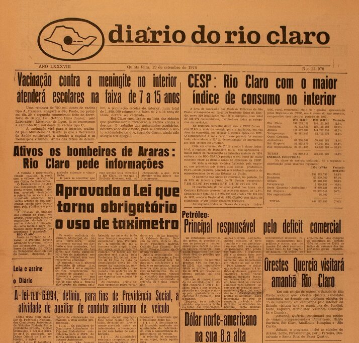 ► Aprovada a lei que torna obrigatório o uso de taxímetro. Na sessão ordinária da Câmara Municipal, da última terça-feira, após transcurso normal em plenário e nas comissões, foi aprovado projeto de Lei 22-74 que torna obrigatório o uso de taxímetro, nos carros de aluguel, com suas respectivas emendas.