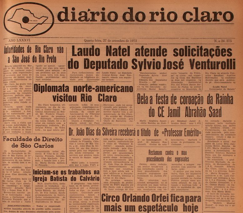► “Advogados em apuros” na Sociedade Italiana. Trata-se de um espetáculo beneficente, a apresentação de hoje do teatro Cultural Italo-Brasileiro no palco da Sociedade Italiana, horário das 20,30 horas. Sob a direção do sr. Archangelo José Cesar, o TCIB levará à cena a comédia “Advogado em Apuros”, com a interpretação feliz de seu simpático elenco. No próximo sábado, será novamente a vez de Corumbataí aplaudir o grupo teatral rioclarense com a peça “Não te conto nada” de Ariovaldo Pires.