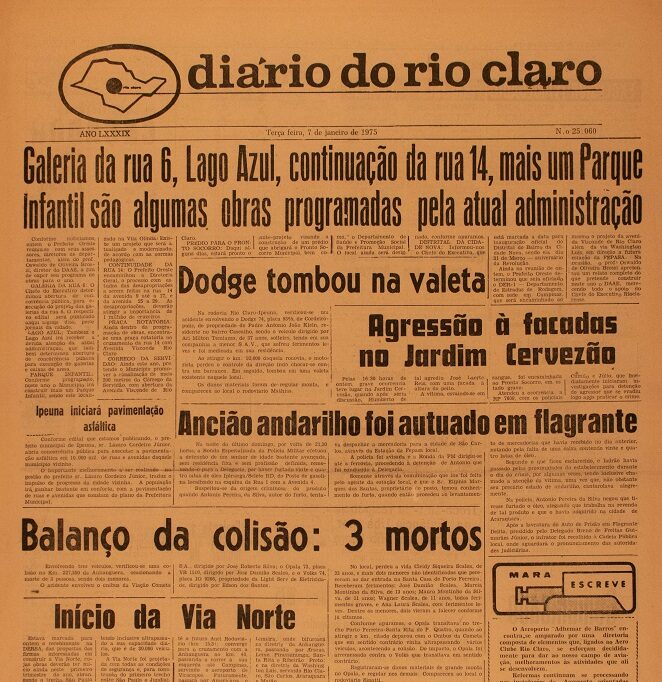 ► Dodge tombou na valeta. Na rodovia Rio Claro-Ipeuna, verificou-se um acidente envolvendo um Dodge 74placa 9365, de Cordeirópolis, de propriedade do padre João Antonio Klein, residente no bairro Cascalho, sendo o veículo dirigido por Ari Milton Temiazzo, de 37 anos, solteiro, tendo em sua companhia a menor S.A.V. que sofreu ferimentos leves e foi medicada em sua residência.