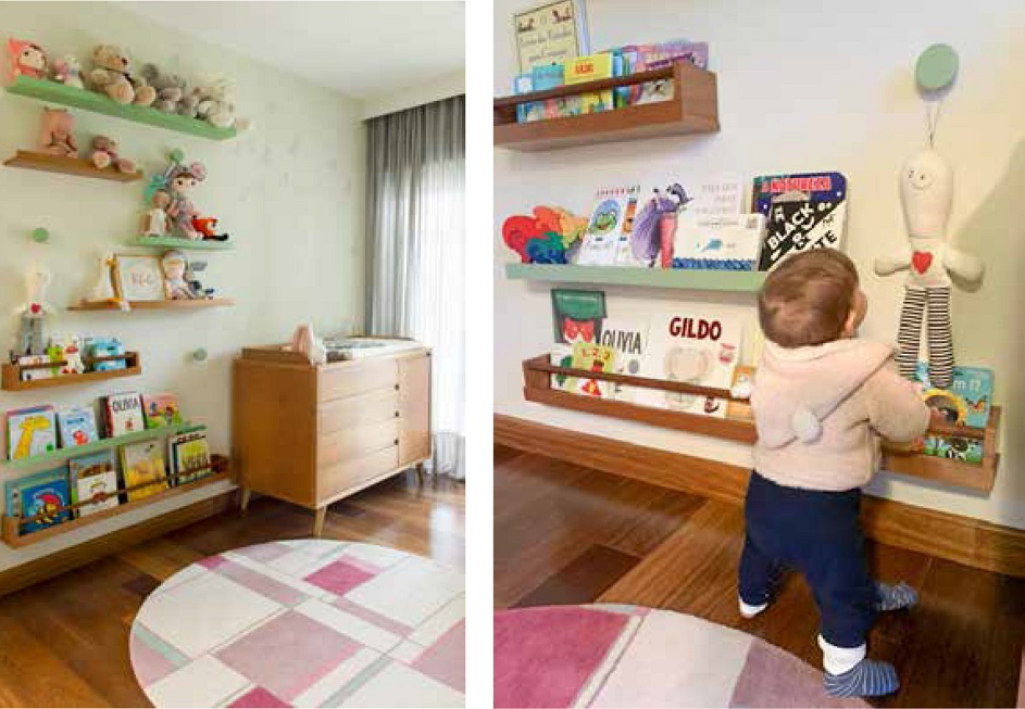 Em primeiro lugar, ela enfatiza a importância de criar espaços multiuso e explica ser essencial considerar a funcionalidade de móveis com espaços de armazenamento embutido, como gavetas, nichos ou prateleiras, que ajudam a manter os brinquedos organizados e ao alcance das crianças.